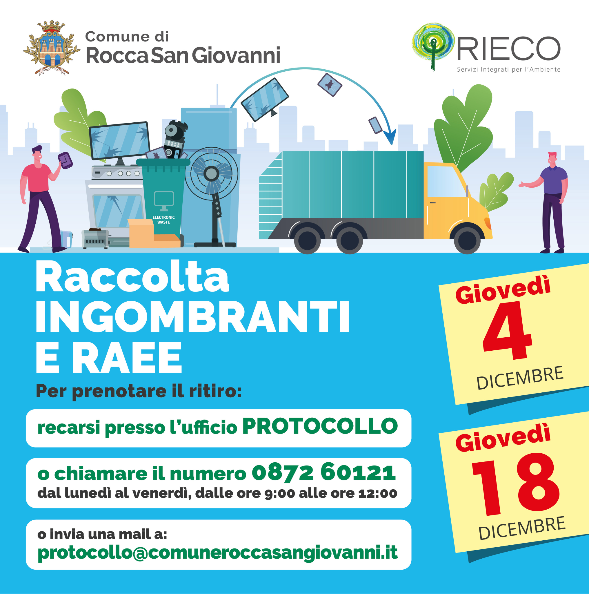 L’Amministrazione Comunale comunica, inoltre, che la raccolta dei rifiuti classificati come ingombranti e di quelli speciali RAEE (Rifiuti Elettrici ed Elettronici) sarà effettuata giovedì 4 e 18 dicembre 2025. Per prenotare il ritiro basta recarsi direttamente presso l’Ufficio Tecnico nei giorni di apertura al pubblico oppure chiamare al numero 0872 60121 dal lunedì al venerdì dalle ore 9:00 alle 12:00.